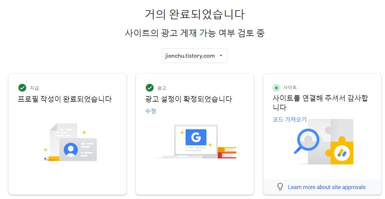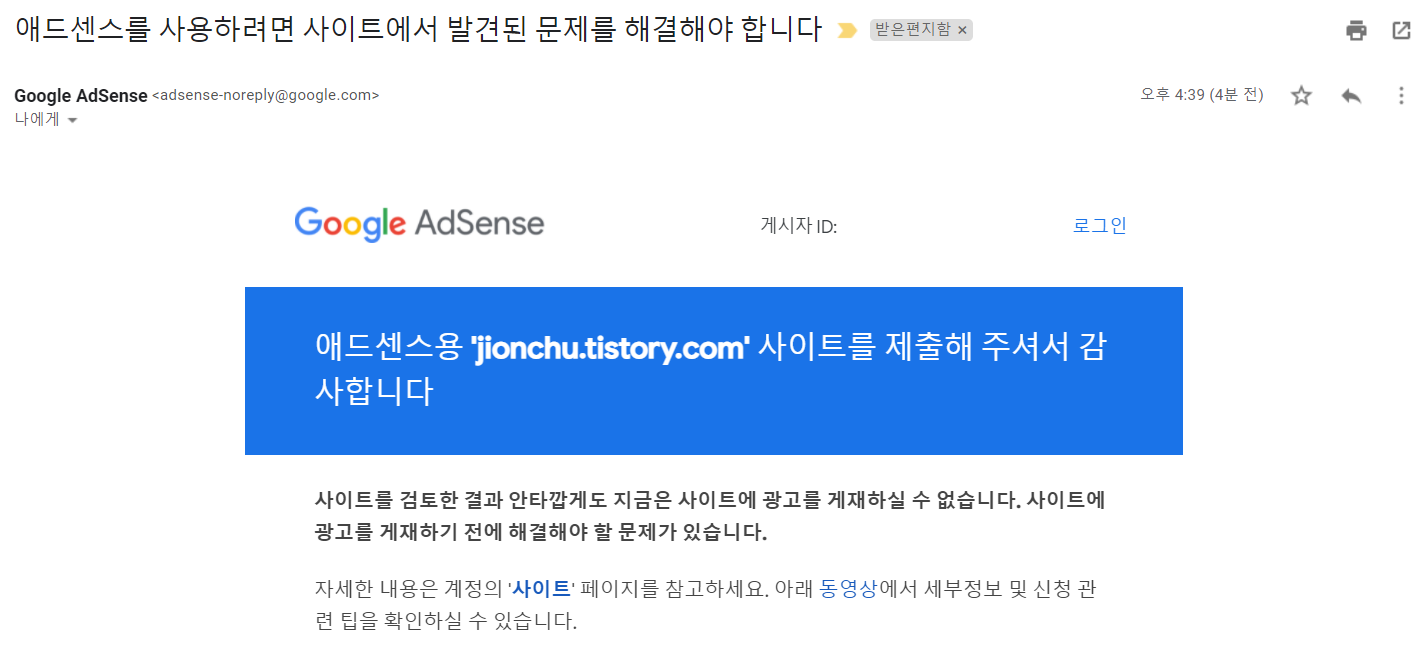사이트에 문제가 있어서 광고를 게재할 수 없다는 메일을 받았다..! 무슨 문제일까 하고 '사이트' 페이지를 들어가보니 블로그 html에 코드를 붙여넣지 않아서 생긴 문제였다.