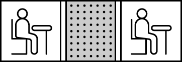 | 위 그림처럼 자리 사이에 파티션이 존재한다면 맨해튼 거리가 2여도 거리두기를 지킨 것입니다. | 위 그림처럼 파티션을 사이에 두고 앉은 경우도 거리두기를 지킨 것입니다. | 위 그림처럼 자리 사이가 맨해튼 거리 2이고 사이에 빈 테이블이 있는 경우는 거리두기를 지키지 않은 것입니다. |