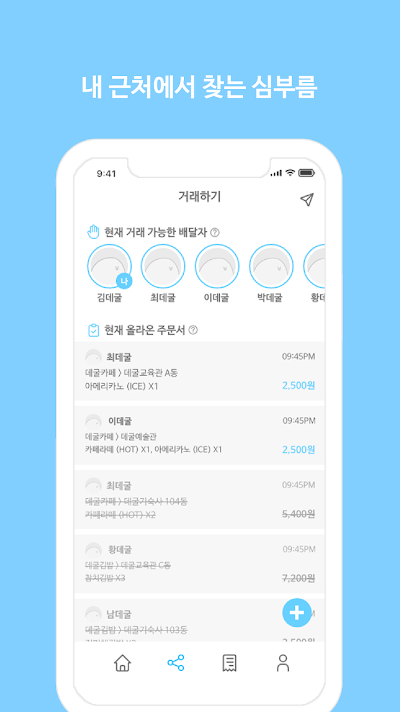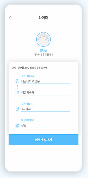 ON 상태로 변경된 라이더는 거래하기 탭의 '현재 거래 가능한 배달자'에 프로필이 추가되게 된다. 주문을 하려는 사용자는 리스트에 표시된 라이더 프로필을 눌러 해당 라이더의 활동가능 경로와 활동가능시간을 확인하고 원하는 경우 라이더에게 배달을 요청한다는 알림을 보낼 수 있다.